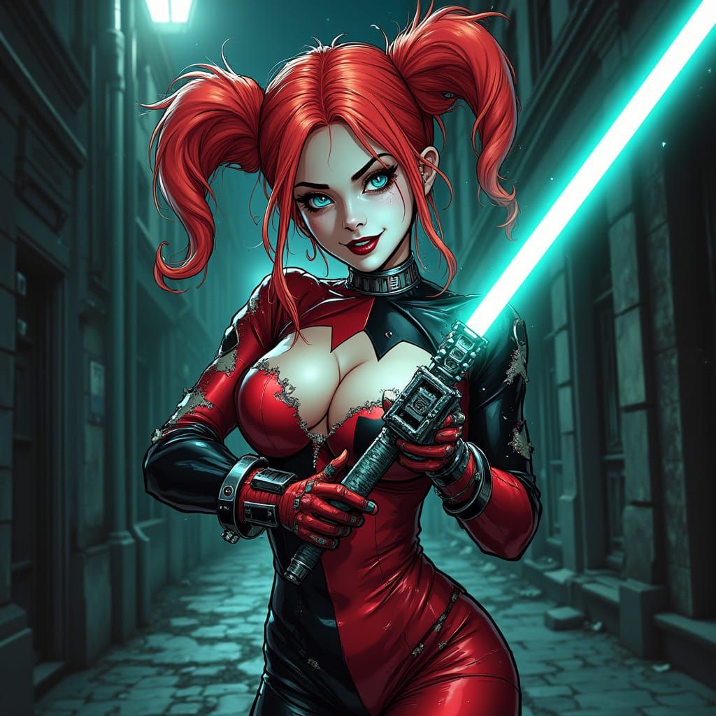 This image depicts a dynamic, comic book-inspired scene of a female character, dressed in a torn red and black jester costume, holding a sleek teal lightsaber with intricate circuitry patterns, set against a dark and gritty Gotham City backdrop, in a bold and vibrant style