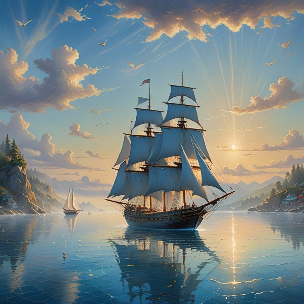 A tranquil scene of blue sails gliding on a blue sea beneath a blue sky. The image evokes a dreamy, ethereal quality with soft mist reflections and a warm, golden light, reminiscent of luminism.