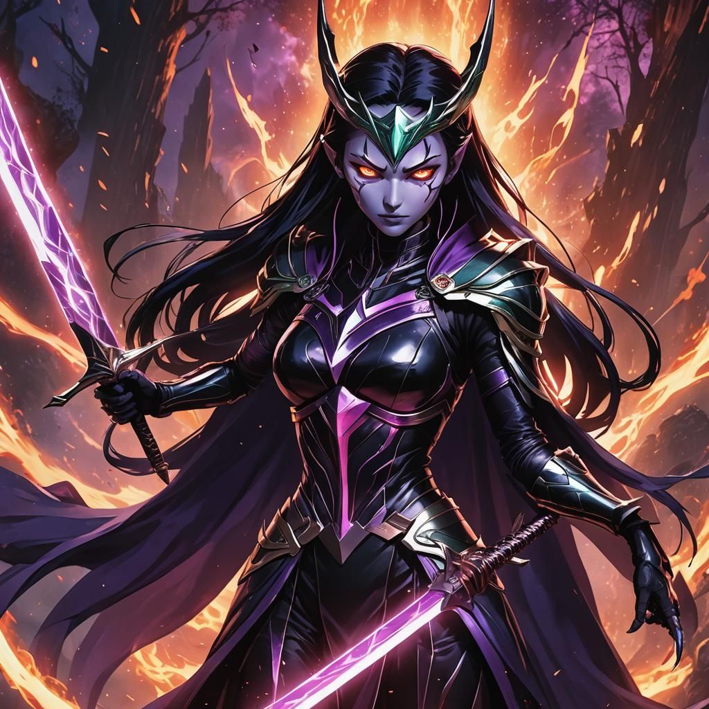 Marvel Hela the asgardian goddess of death but as a beautiful and hot anime antagonist with cool powers and very large and attractive assets