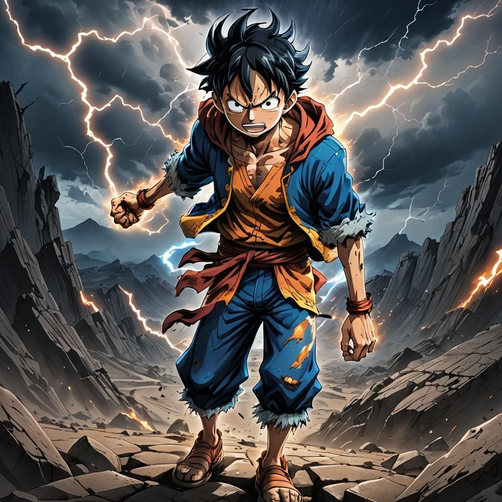 A dynamic anime illustration of Joy Boy Luffy on a desolate landscape. The image is cel-shaded with cinematic lighting, showcasing electric blue and orange lightning in a stormy sky in Studio Trigger style.