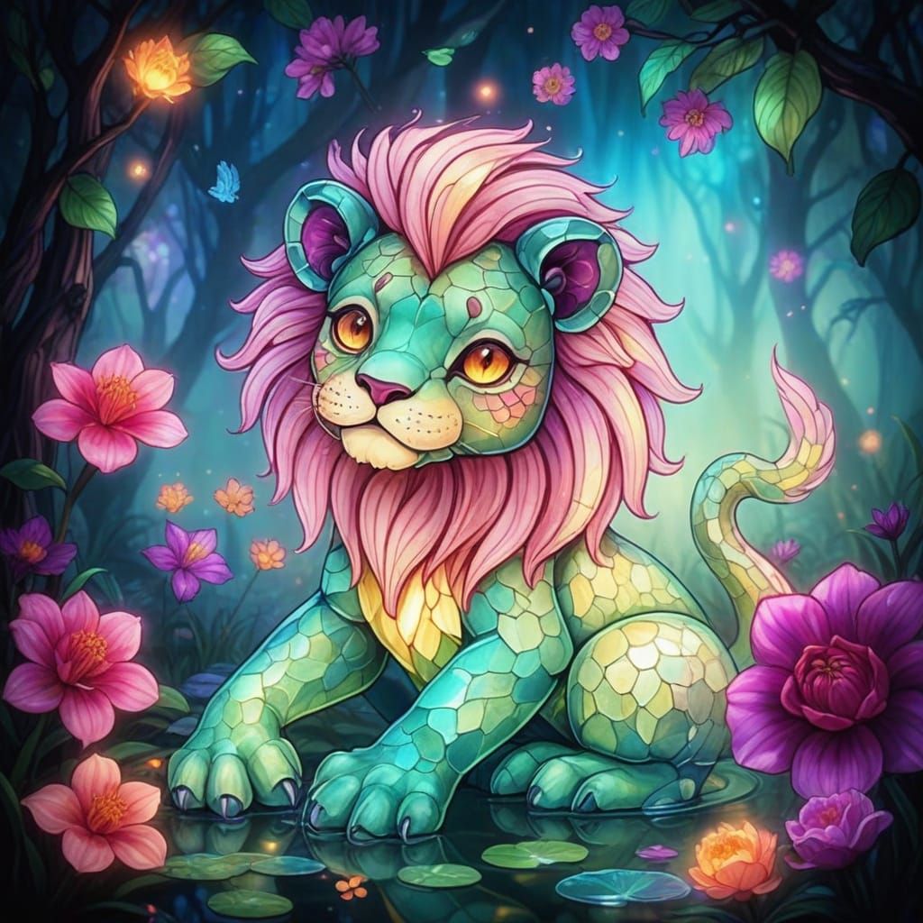 This image shows a whimsical lion-amphibian hybrid in a swampy forest setting. The fairycore style illustration features iridescent colors, a glossy glass texture, and soft shadows with pastel and aurora gradients.