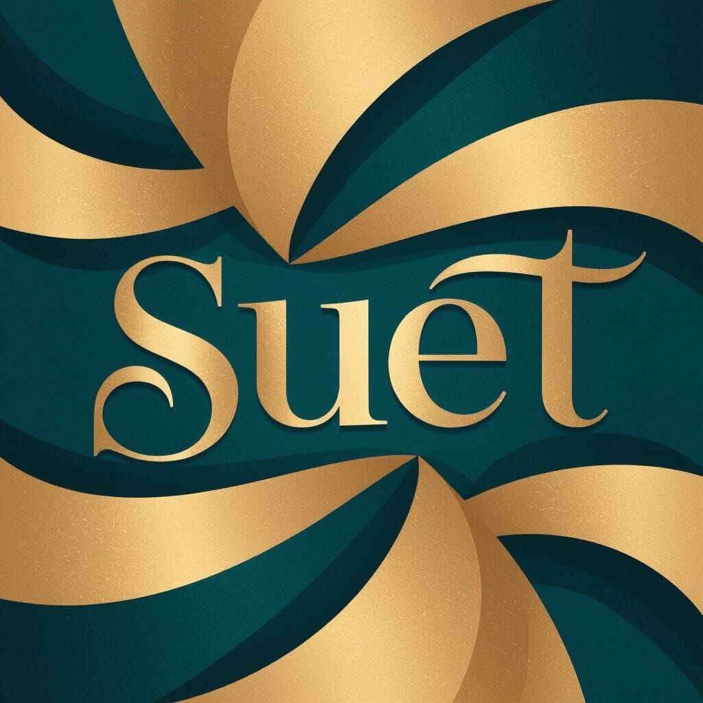 This image showcases a sophisticated, modern typographic logo for SueT, blending deep teal and metallic gold with subtle gradients for a luxurious feel. Vector illustration with clean lines.