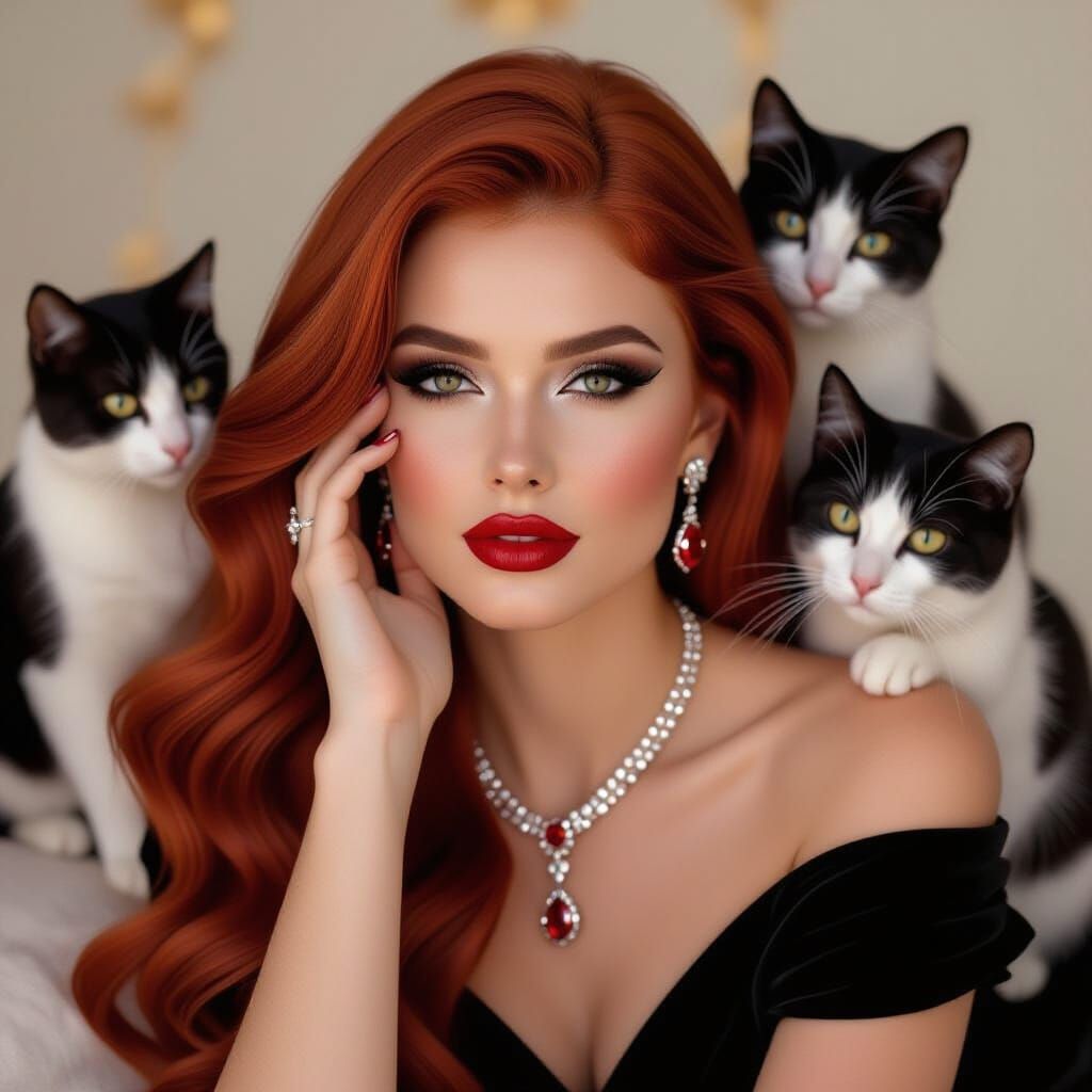 A stunning cinematic film still of a goddess with flowing red hair, dramatic makeup, and jewelry, photobombed by curious cats. Shot with film grain and atmospheric lighting for a masterpiece quality.