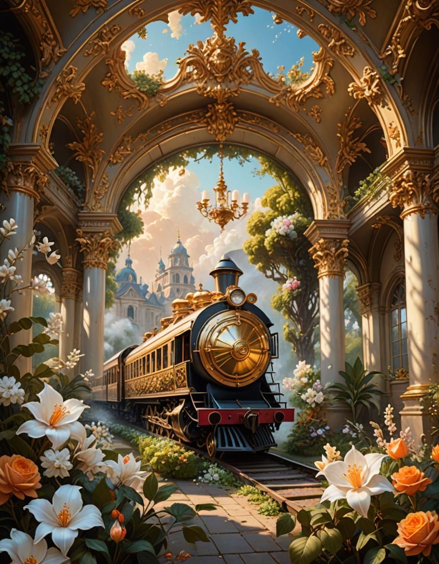 This enchanting oil painting depicts an ancient train station in a fantastical, vintage style, surrounded by lush foliage and adorned with intricate details, warm golden lighting, and luxurious textures, evoking a sense of nostalgia and wonder.
