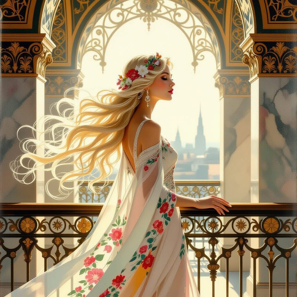 Easily generate ethereal women with floral patterns and ornate balconies. Try our free AI image creator today!