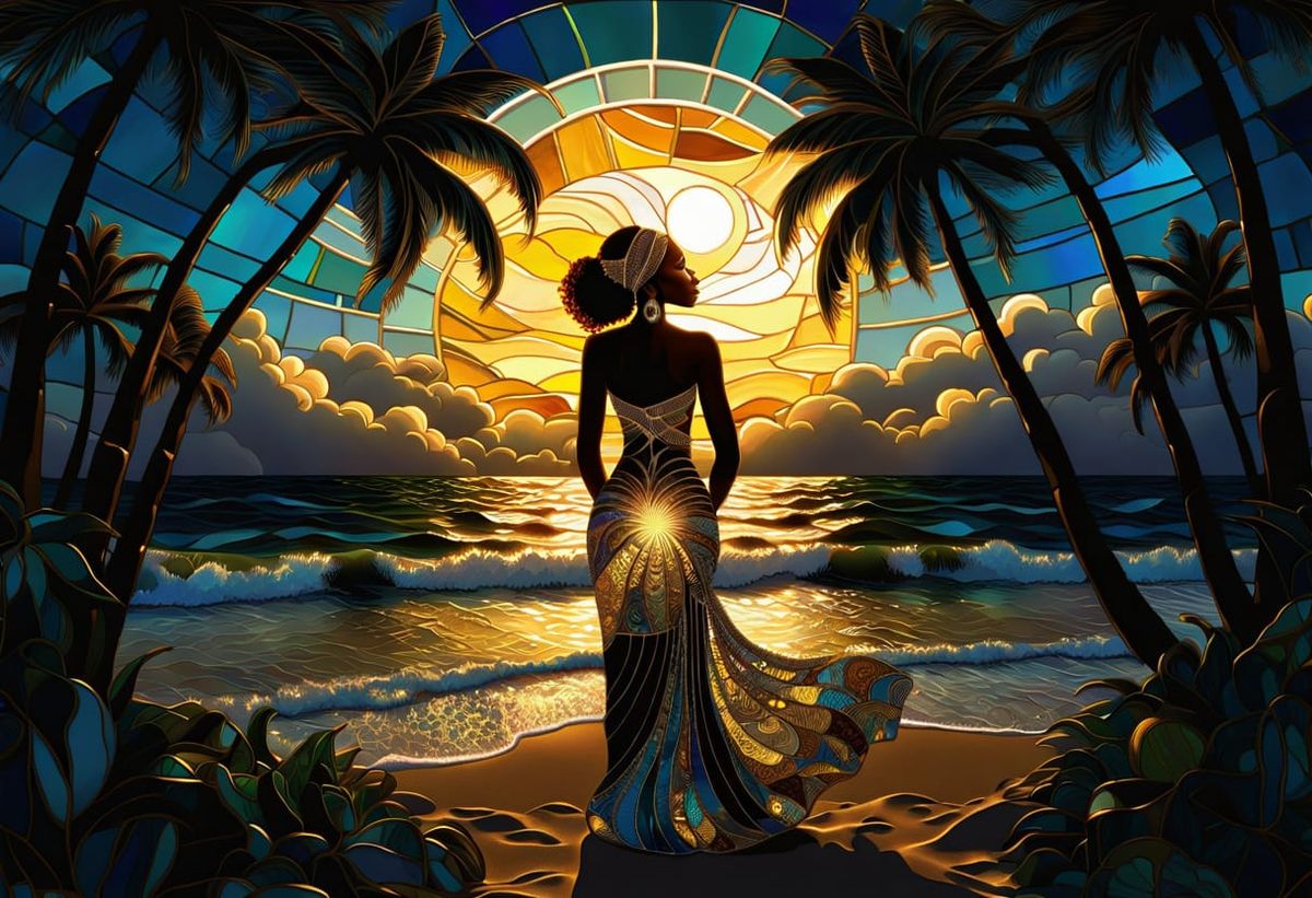 This image shows a stained glass artwork of an African woman on a moonlit beach with palm trees. The image is rendered in a Tiffany style, featuring gold leaf and silver wire.
