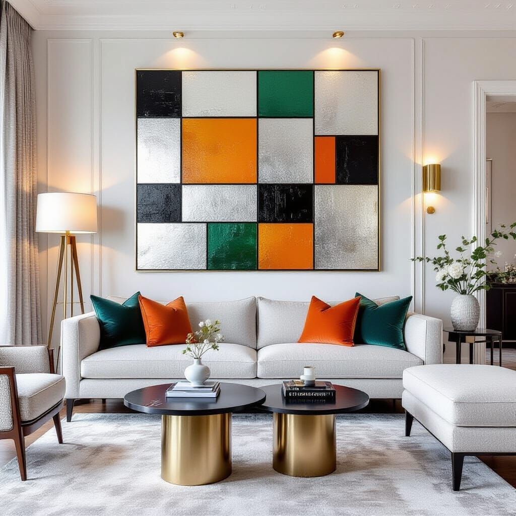 This image shows a contemporary abstract expressionist painting featuring metallic silver, green, black, orange, and white squares. It has bold textures and dramatic lighting, reminiscent of geometric and color-focused art styles.