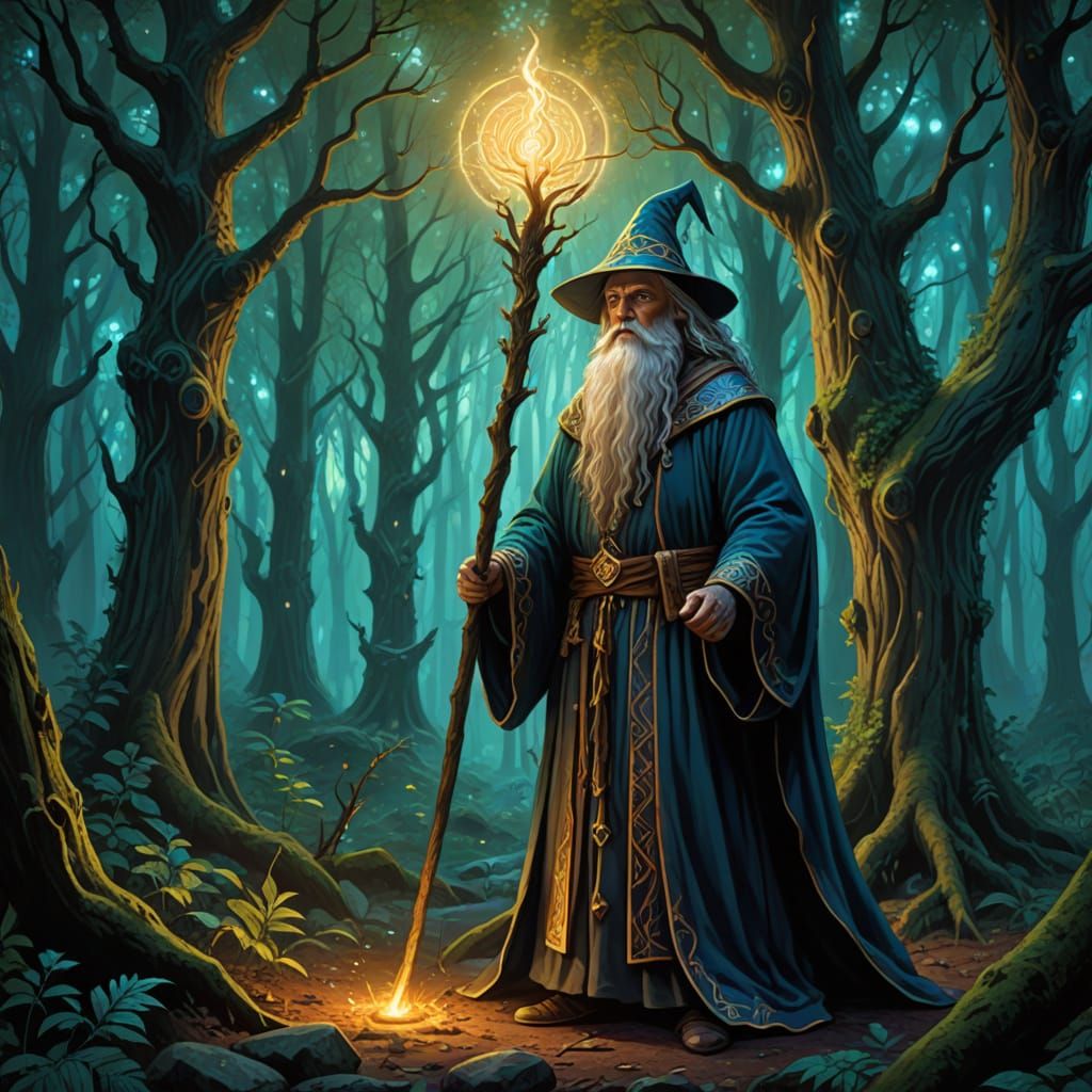 This digital illustration depicts a wizard in vibrant robes holding a staff within an ancient, ethereal forest. Features glowing runes and magical ambiance.