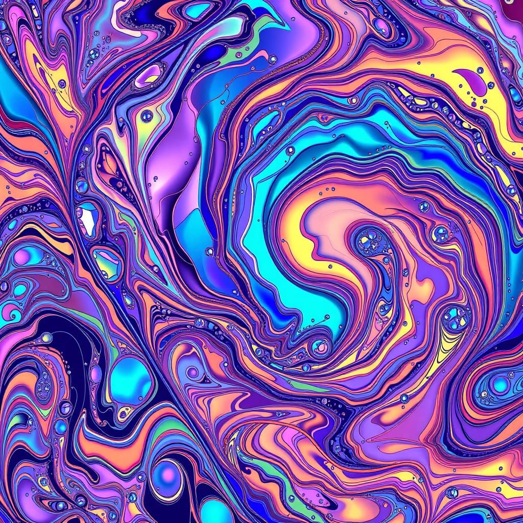 This image shows a vibrant abstract design featuring luminescent colors and swirling patterns. The artwork evokes a liquid glass effect, with intricate fractal details and Zentangle-style lines in a 3D shaded style.