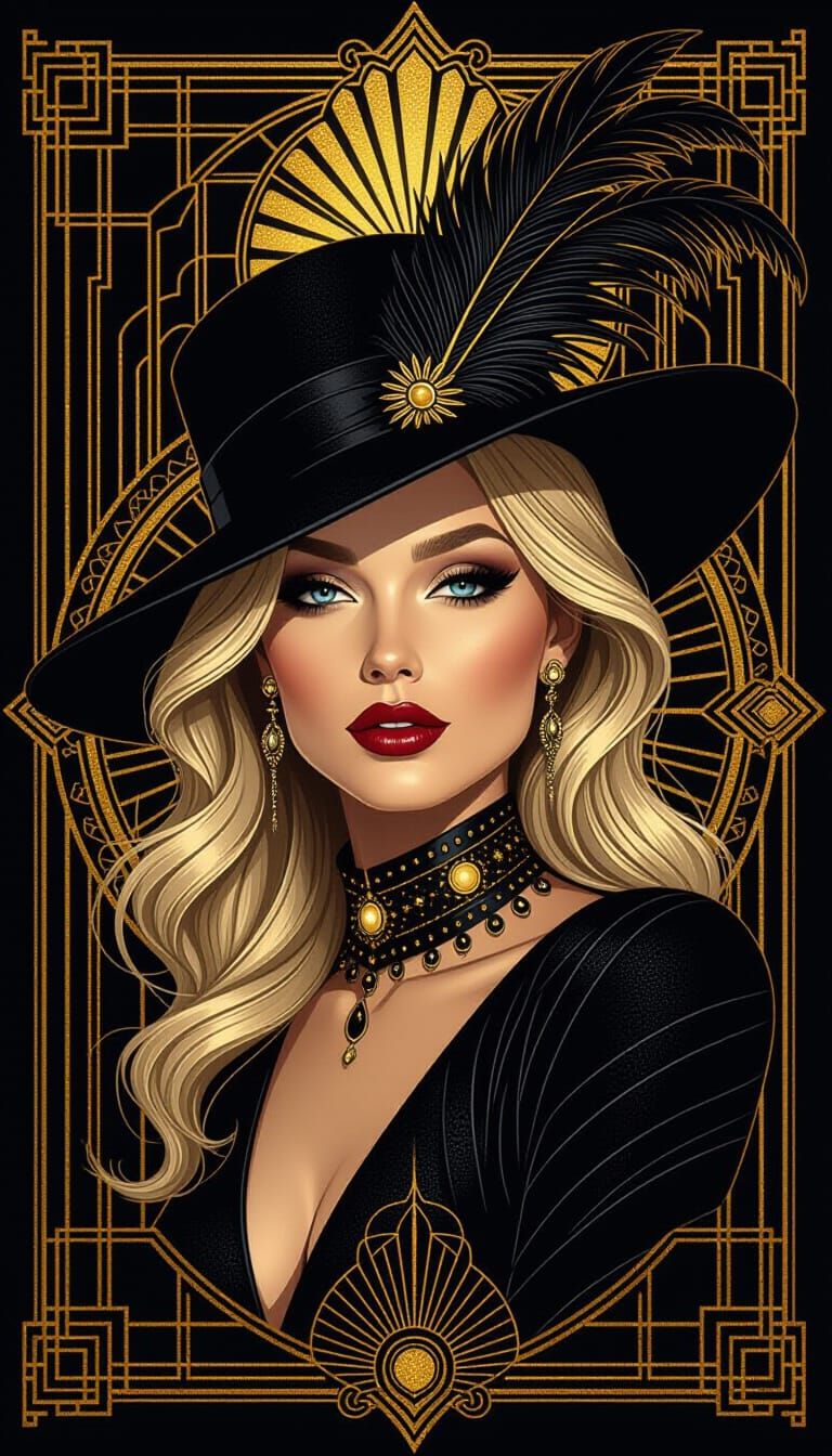 This image features a striking woman with blonde hair and painted eyes, wearing a black art deco hat with feathers. It's a biomechanical cyberpunk illustration with neon and gold highlights.