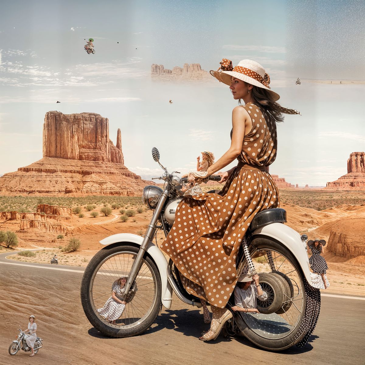 A woman in a 1950s-style polka dot dress and hat rides a motorcycle through Monument Valley, Arizona. This image evokes a sense of retro adventure.