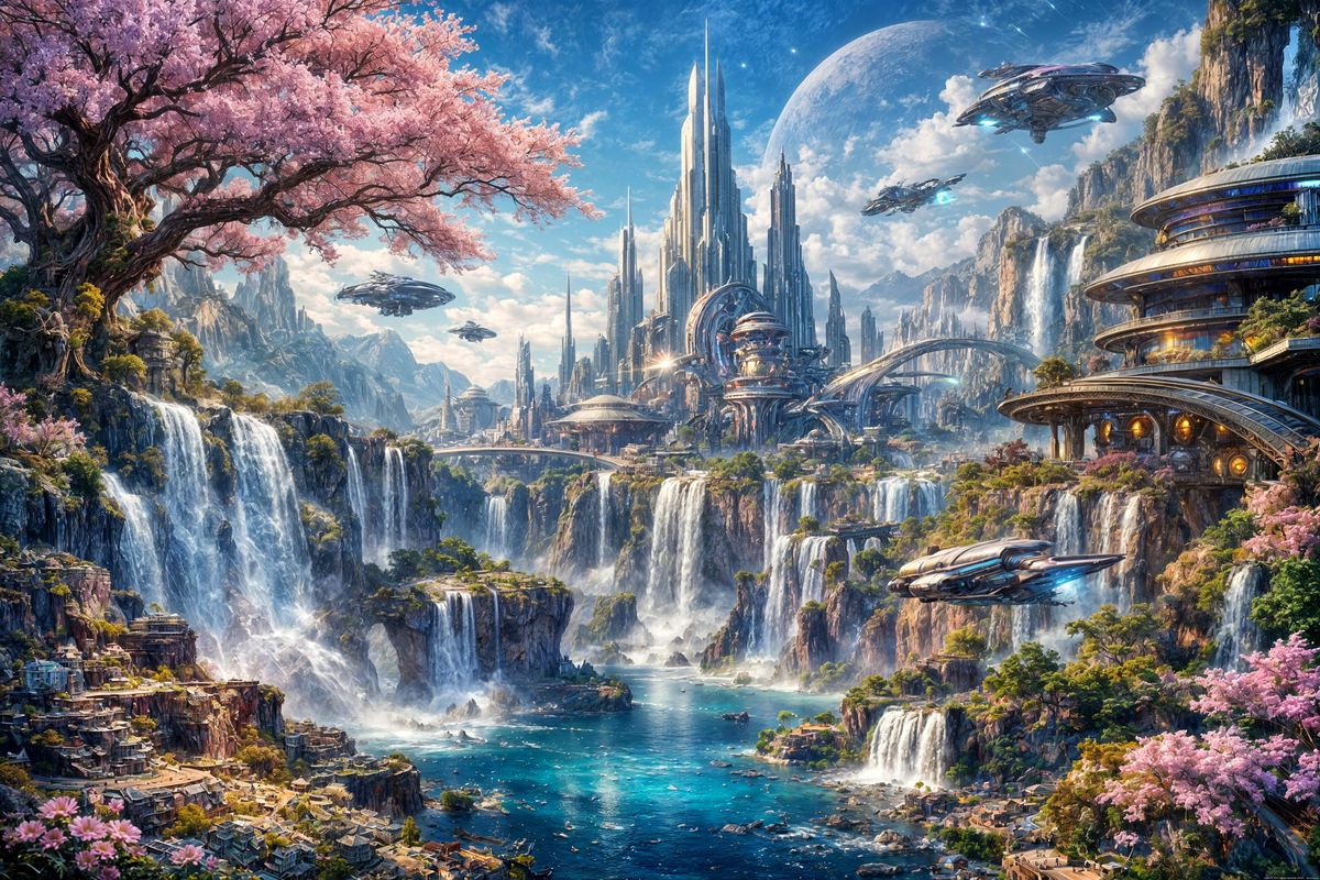 This image shows a unique blend of fantasy and futuristic elements. Towering trees and waterfalls meet advanced city structures and flying vehicles, creating a captivating scene.