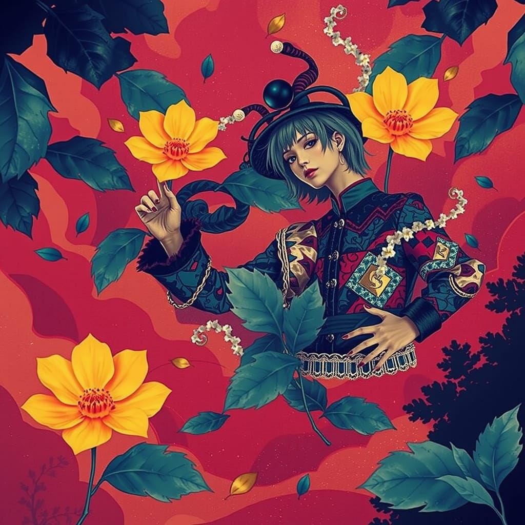 This image depicts a dense, foggy forest scene with vibrant green leaves and a striking blue sky. Elements of fantasy and diverse cultural attire are subtly integrated, rendered with hyper-realistic detail.