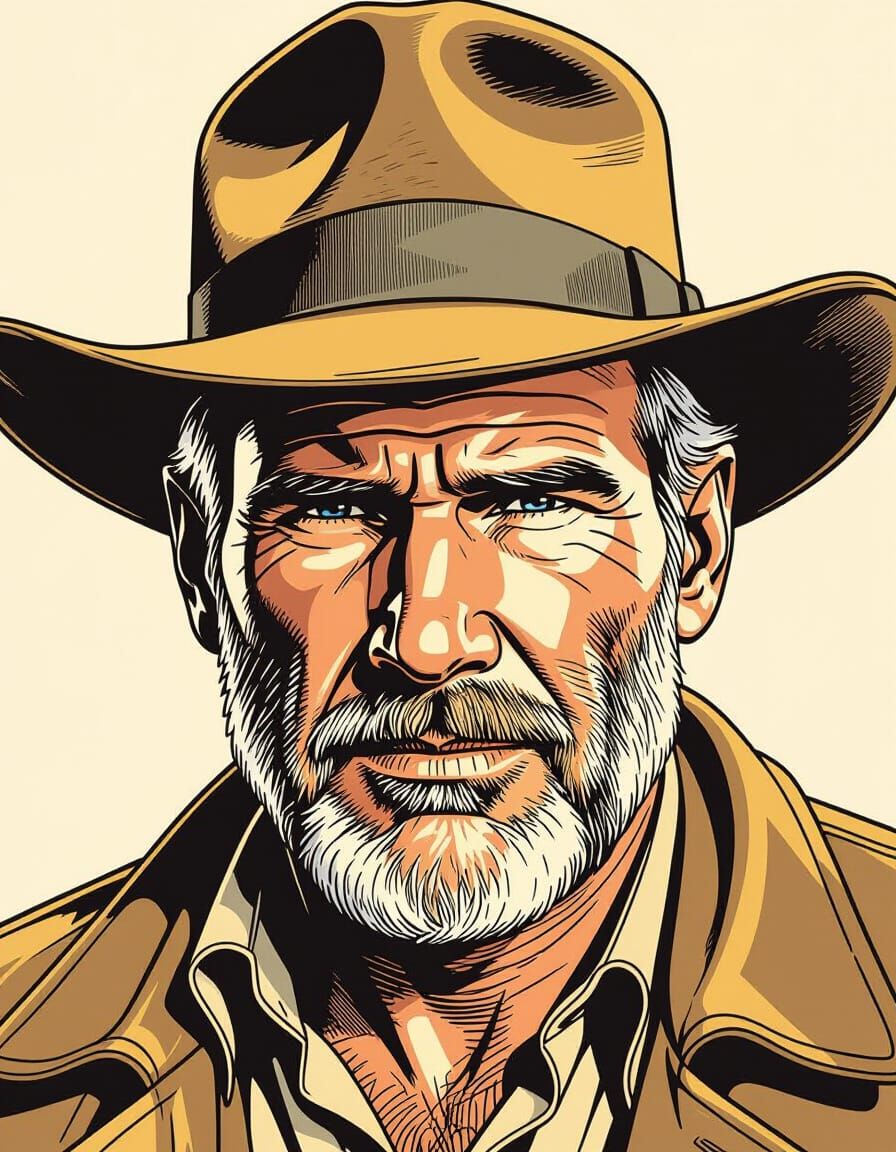 This image shows a close-up portrait of an aged Indiana Jones with a gray beard, rendered with flat colors. The artwork mimics a vintage comic book panel.