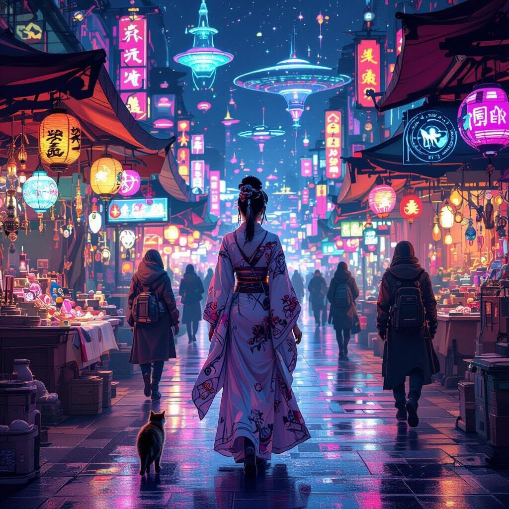 This image shows a goddess and her cat strolling through a vivid, neon-illuminated night market in a futuristic city with oriental influences. Humans, nomads, and aliens mingle among stalls selling glowing artifacts in a vibrant, fantastical style.
