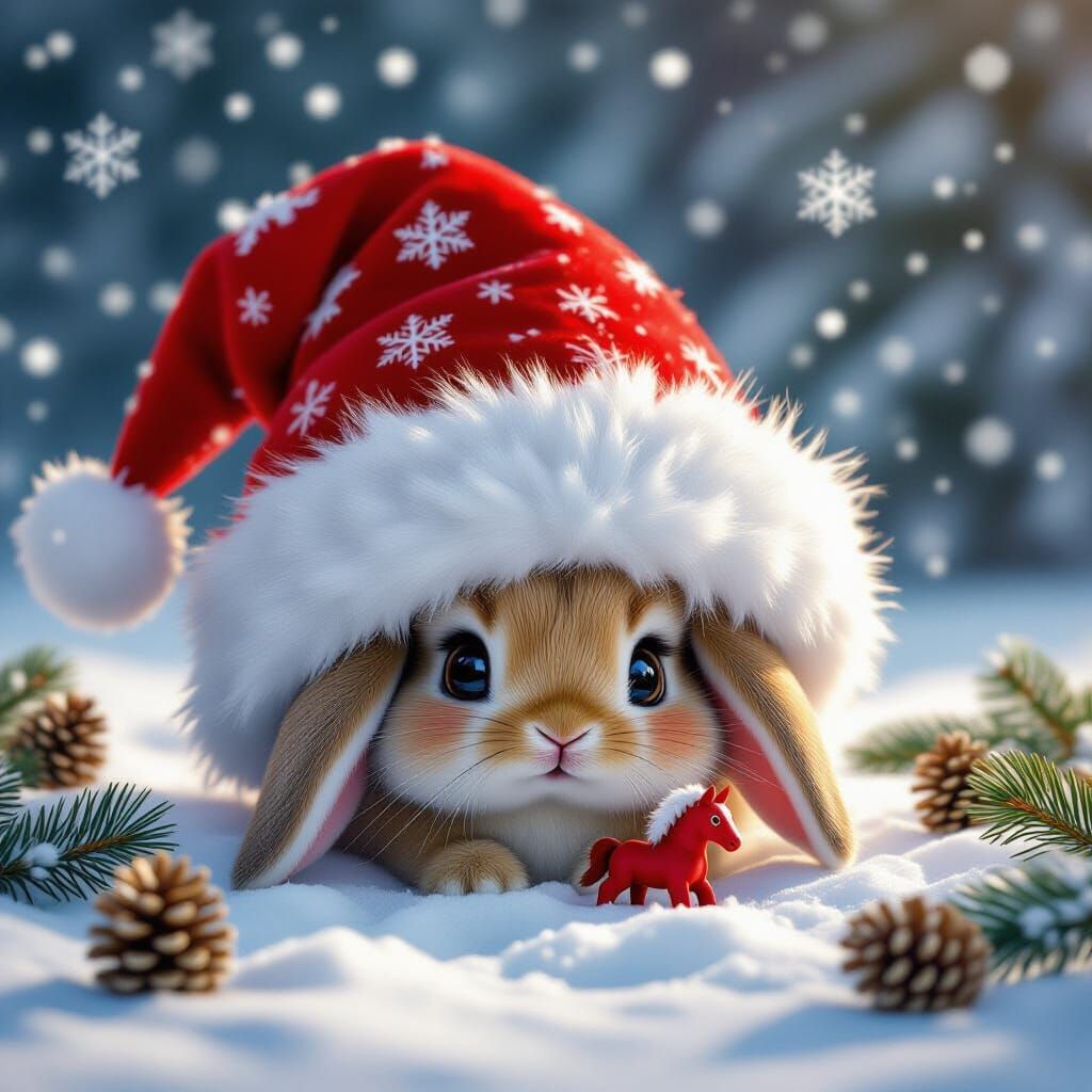 A tiny, fluffy bunny peeks from under a huge New Year's hat in a snowy landscape. Snowflakes fall as gilded pine cones surround the scene, rendered in stunning 8k concept art with cinematic lighting.