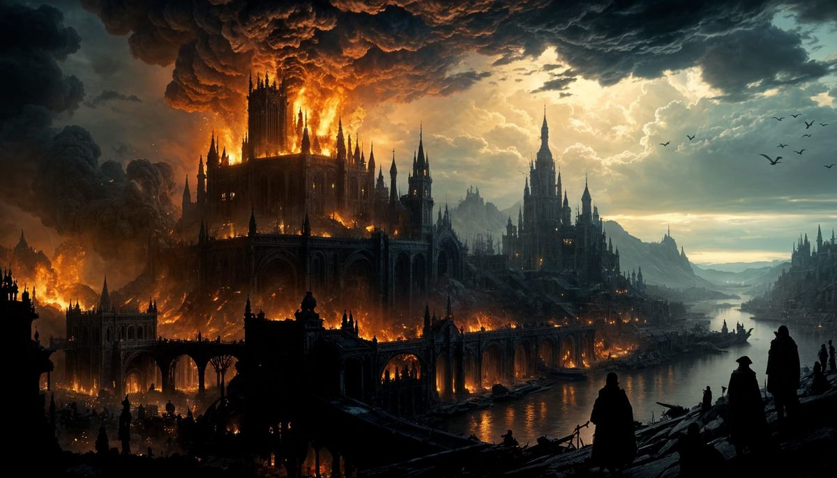 This image shows a city engulfed in flames, rendered with high detail and dramatic lighting. The scene evokes a cinematic feel, reminiscent of high fantasy art with a sinister atmosphere.