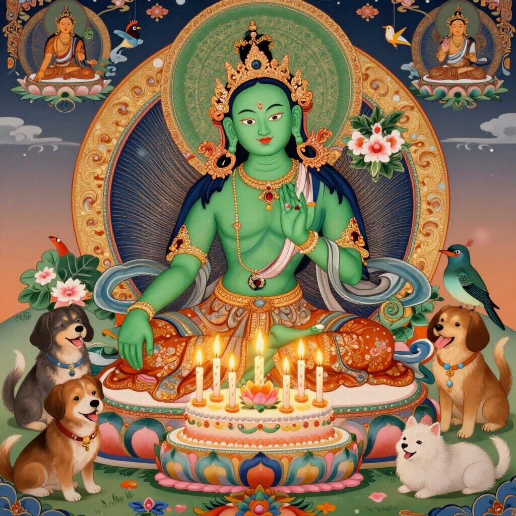 A vibrant poster of Green Tara with a cake, candles, dogs, and birds. Illustrated in a richly detailed, highly saturated style inspired by Tibetan thangka paintings and modern fantasy art.