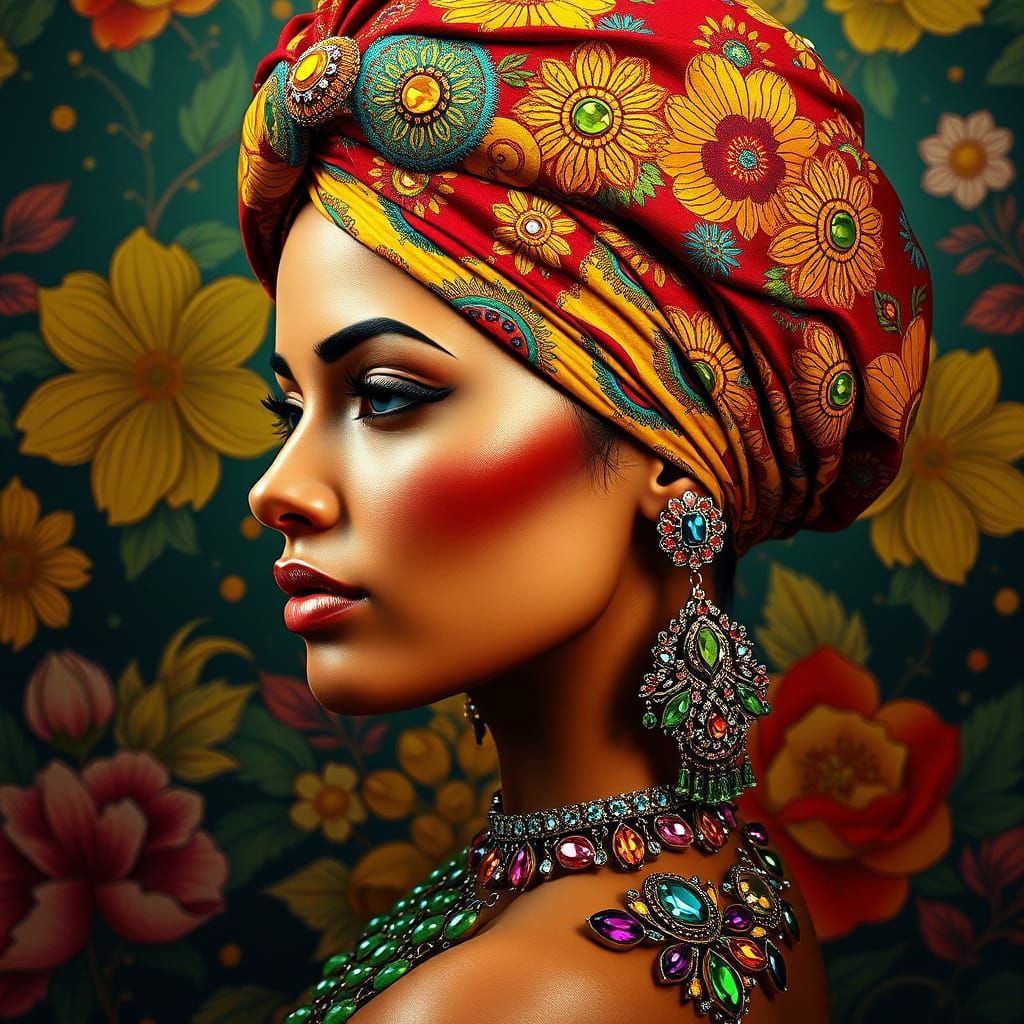 une femme à la peau caramel, de profil, parée d'accessoires vibrants et colorés. Elle porte un turban multicolore orné de motifs floraux et de bijoux étincelants, dans des teintes de rouge, jaune, bleu, vert et rose. Le turban présente des motifs complexes qui ajoutent à sa richesse visuelle. La personne arbore également de grandes boucles d'oreilles ornées ainsi qu'un collier décoré de pierres précieuses multicolores, comprenant du vert, du bleu, du rose et du jaune. L'arrière-plan, est un mélange des motifs floraux et des dessins abstraits dans des tons verts, jaunes et roses. L'ensemble offre une composition visuellement frappante grâce aux couleurs éclatantes et aux décorations minutieuses.
