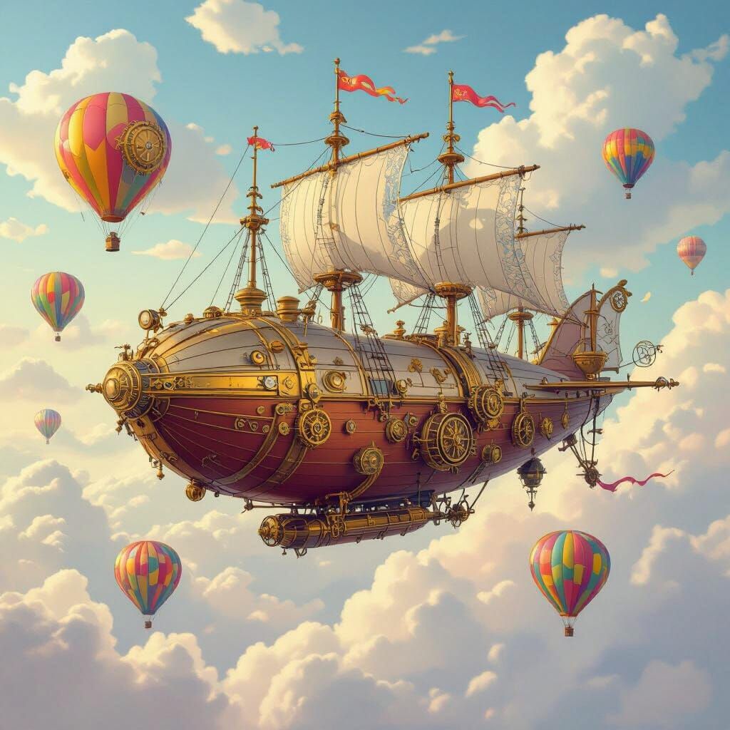 A fantastical steampunk airship floats among fluffy clouds and rainbow balloons. The image evokes a whimsical, animated aesthetic with Victorian-era charm, rendered with polished brass and intricate gears.