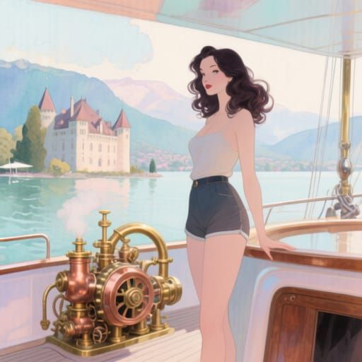 A low-contrast, pastel watercolor portrait of a feminine woman at a yacht club, with a romantic castle backdrop and a subtle steampunk engine integrated into the scene.