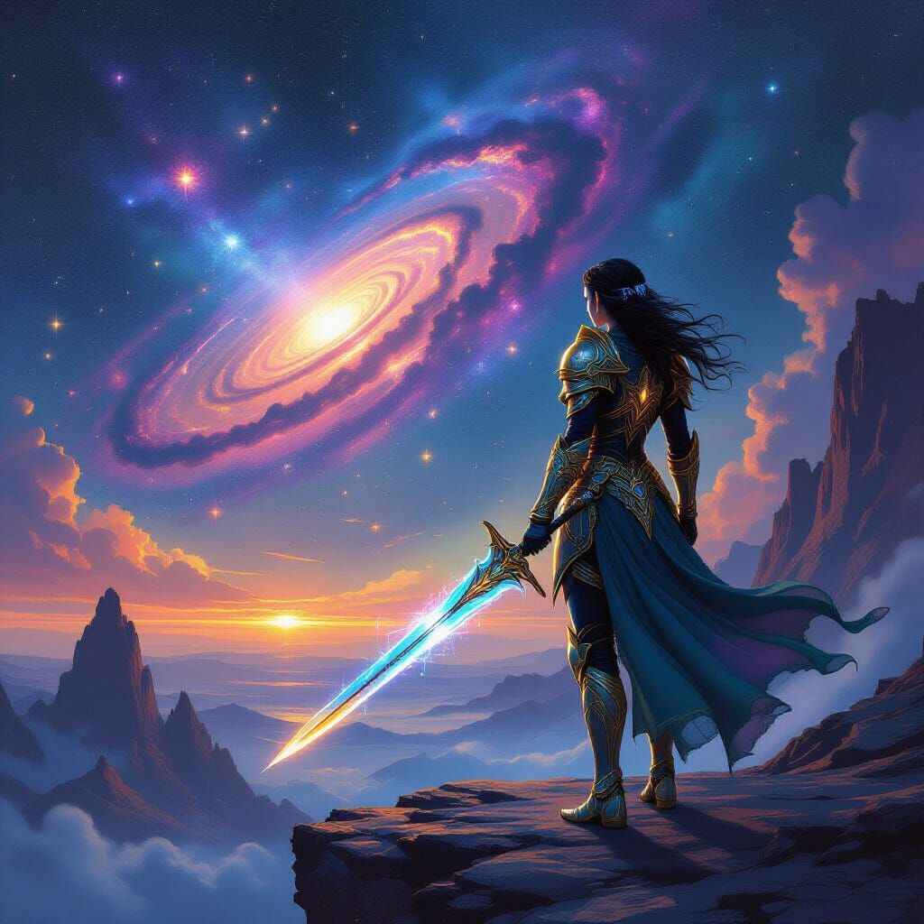 This image shows a lone elven warrior, adorned in radiant armor, observing a faraway galaxy from the edge of a nebula. The fantasy art is rendered with rich colors and textures, evoking classic oil paintings.