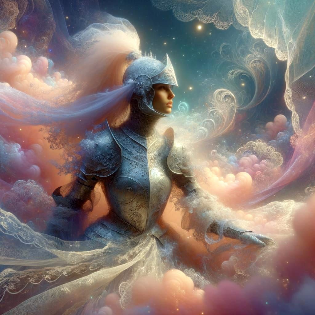 A surreal digital painting of a female knight in delicate, shimmering armor. Ethereal light surrounds her in a dreamlike world of pastel colors and intricate textures, rendered as 8k digital art.