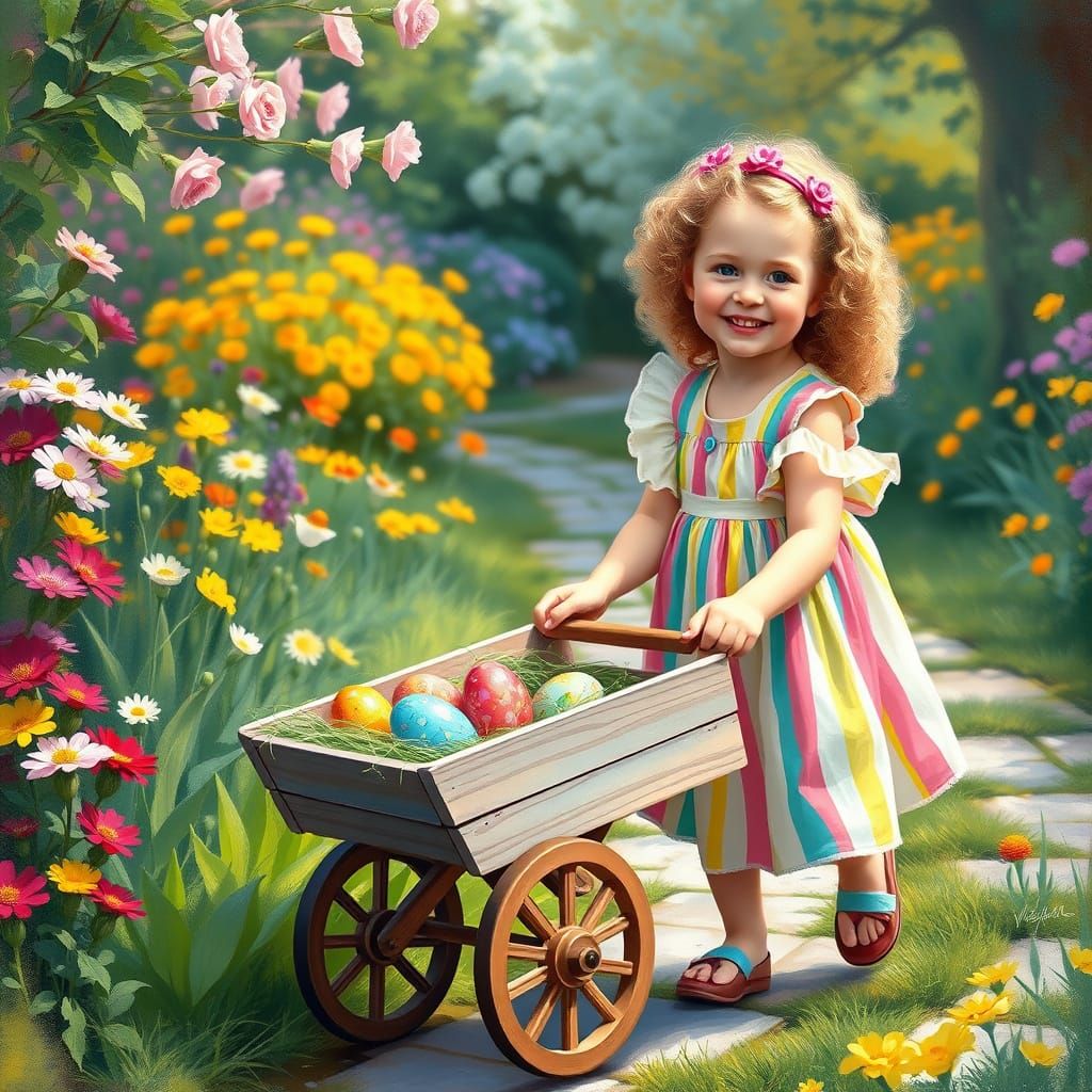 A joyful scene of a blonde girl in a pastel rainbow dress, surrounded by blooming flowers and lush greenery, with soft brushstrokes and vivid colors, reminiscent of early 20th-century Impressionist art