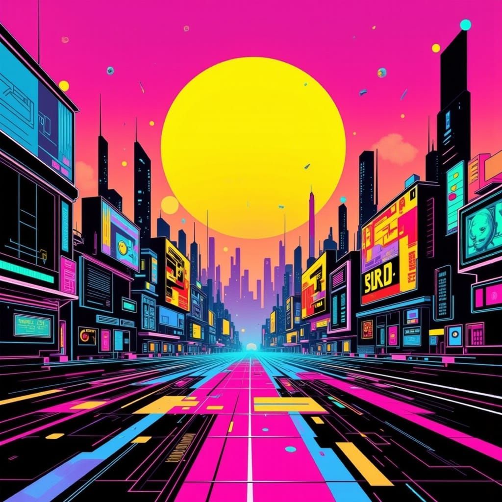 This image depicts a futuristic cityscape at dusk, featuring sleek skyscrapers and geometric shapes in a bold, triadic color scheme reminiscent of Patrick Nagel's style, with high-contrast, 8K resolution digital art that evokes 1980s pop art and the Bauhaus movement's futuristic optimism.