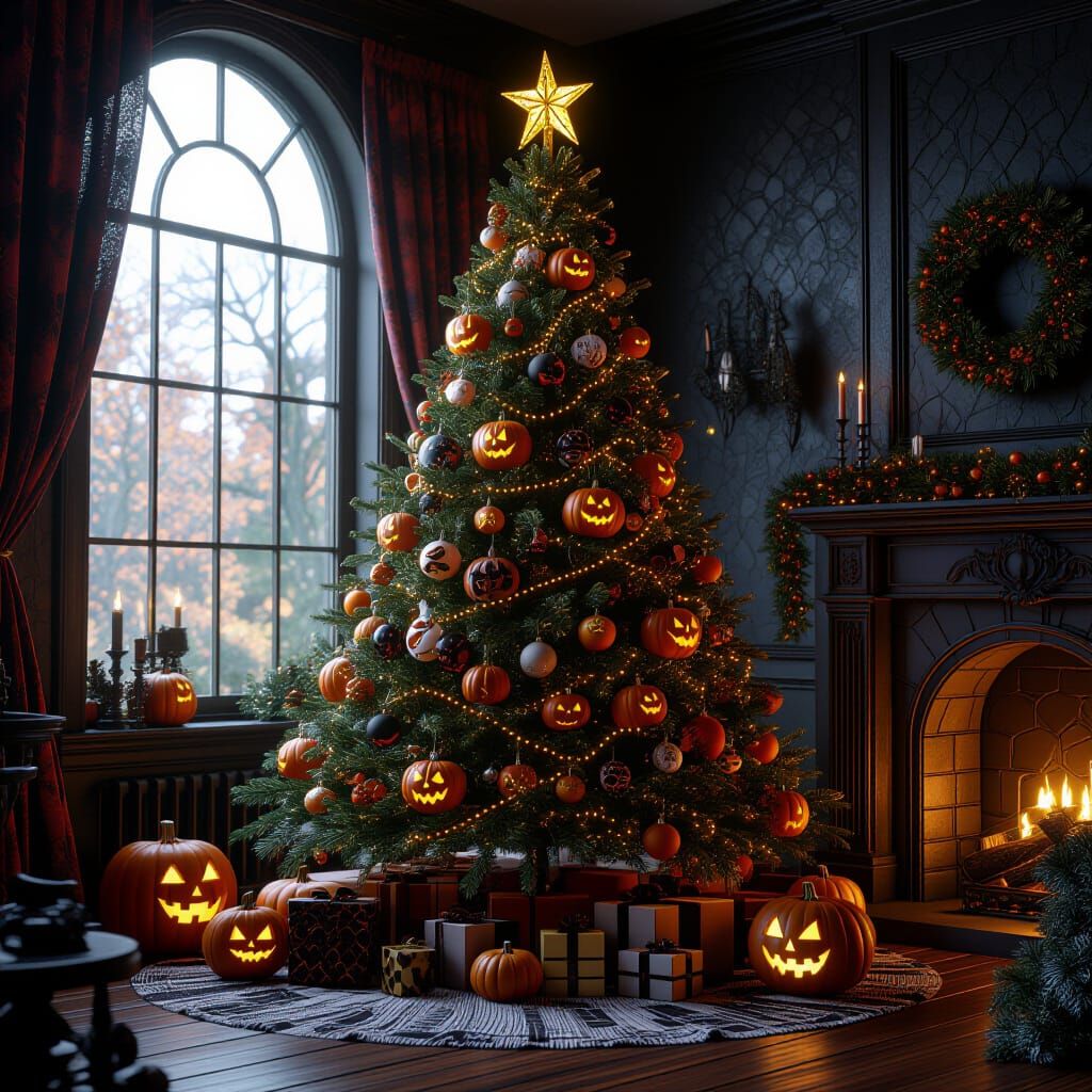 This image shows a detailed fantasy concept art of a Christmas tree adorned with Halloween decorations. Rendered in deep, complementary colors with intricate detail, it showcases a unique blend of holiday themes.
