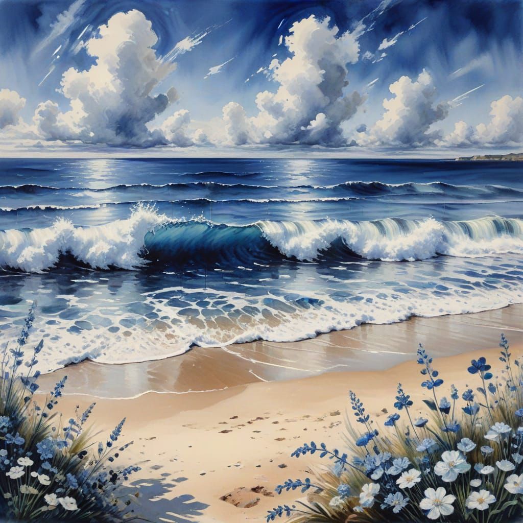 This image shows an idyllic beach scene in a blue and white dichromatic palette. The artwork features intricate details and a perfect composition in the style of ink and wash.