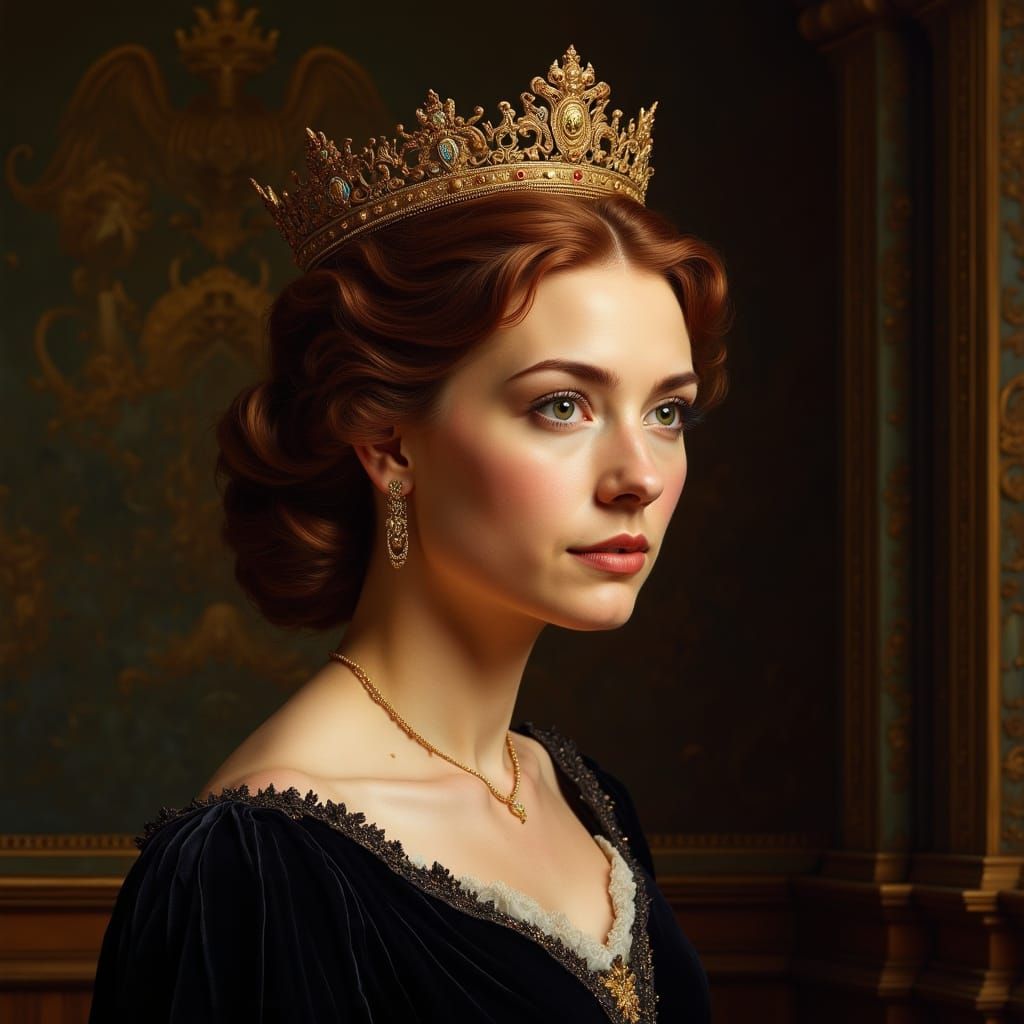This image depicts a woman from the 1800s wearing a black velvet dress and a shining gold crown, rendered with rich colors.
