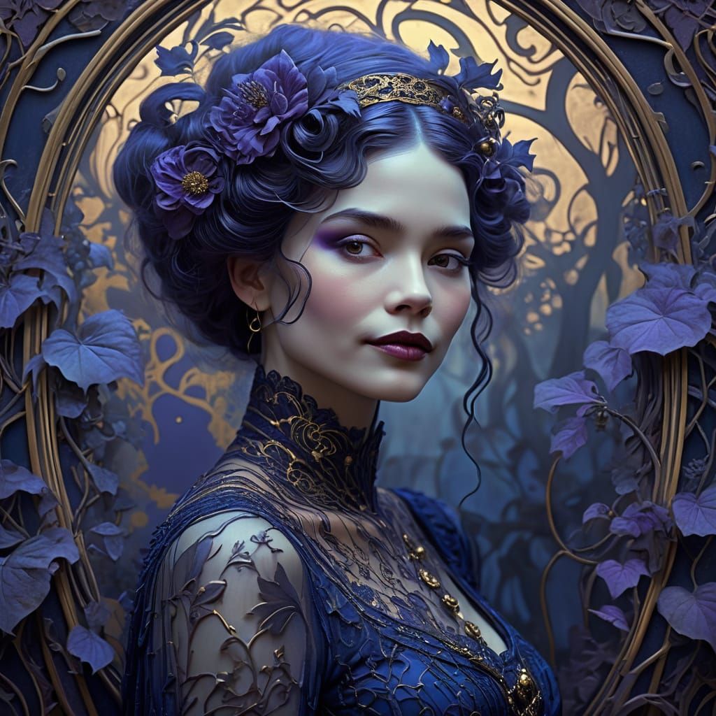 Art Nouveau. Medium shot. A mysterious, intricately dressed woman with a wicked grin, surrounded by swirling patterns and vines. Soft focus. Mucha-inspired, with bold lines and organic shapes. Whispers of eerie fog. Midnight blue, with hints of purple and gold. Soft, ethereal lighting. Best quality, ...