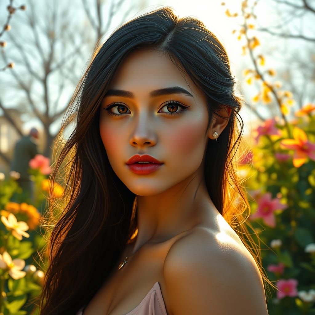 This image shows a stunning digital portrait of a beautiful young woman amidst a vibrant spring garden, surrounded by lush greenery and blooming flowers, with intricate details, dynamic lighting, and hyper-realistic textures reminiscent of Art Nouveau and cutting-edge digital art.