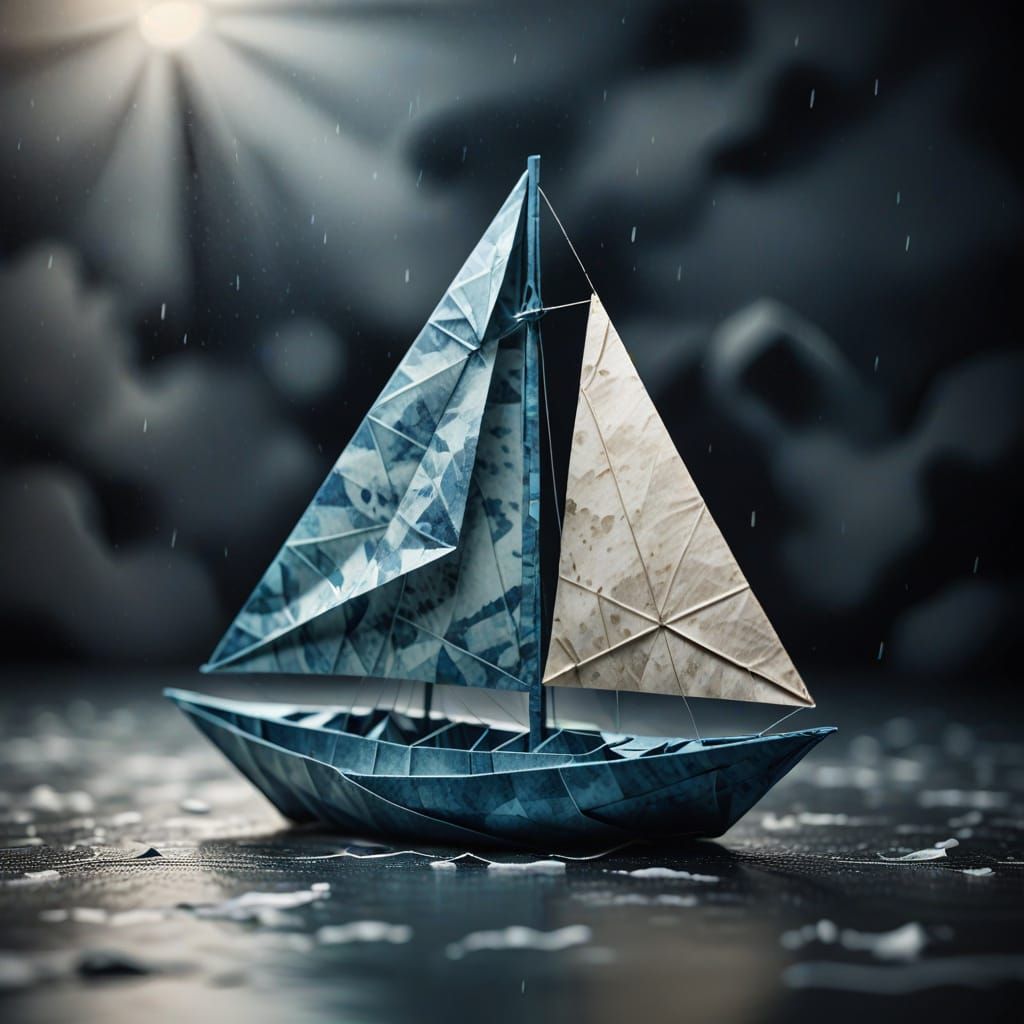 This image shows a paper sailboat navigating a storm, rendered in delicate origami style. The artwork features soft watercolor effects, intricate paper folds, and a muted, moody color palette.