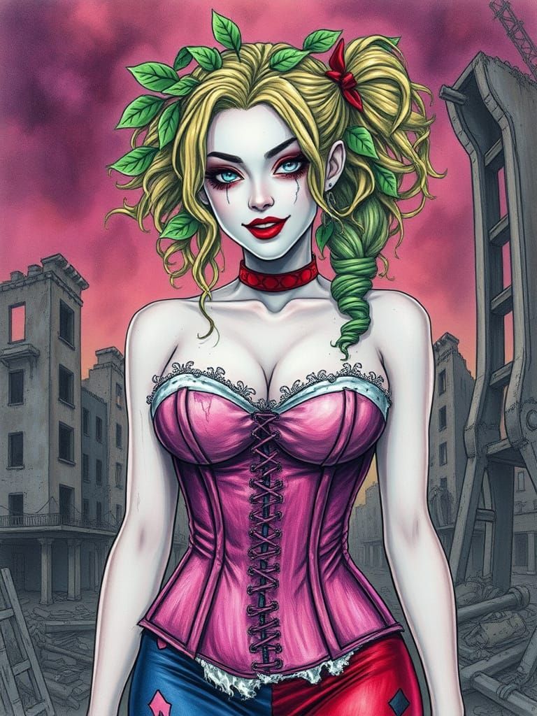 This image shows a fantastical post-apocalyptic world with a vibrant, gradient-colored corset and a whimsical storybook style, featuring intricate pencil sketch details and a mix of realistic and hand-drawn elements.