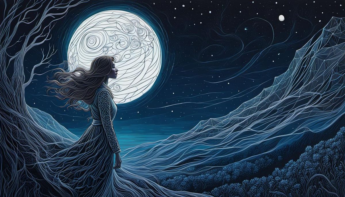 Detailed line art of a girl in a moonlit night, evoking wonder
