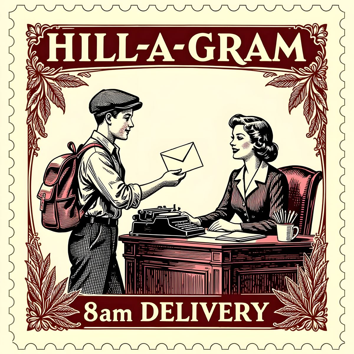 This image features a vintage stamp design in crimson and black, showcasing a delivery man handing an envelope to a secretary. Includes office details like a typewriter and clock.