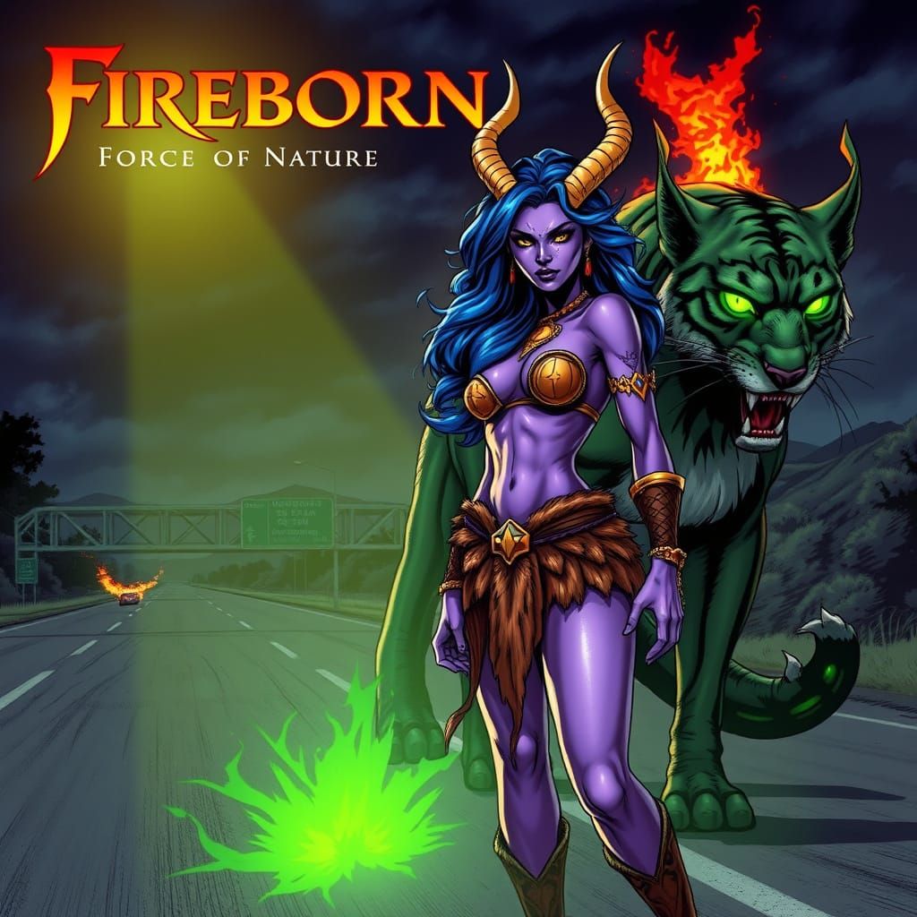 This fantasy concept art features a purple-skinned Tiefling sorceress and druid with blue hair and gold horns, alongside a fearsome green cougar. The scene is set on a dark Georgia highway, rendered with dramatic linework and vivid backlighting.