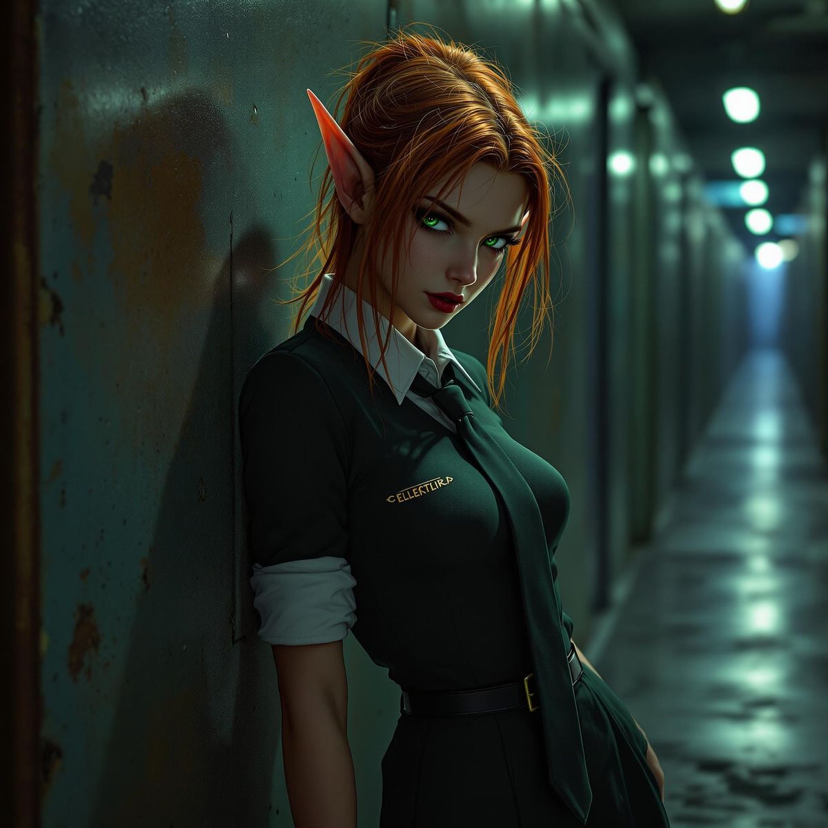 This captivating image features a dark-haired, green-eyed elf girl exuding a snarky attitude, set against a dystopian backdrop with intricate textures and industrial elements. Inspired by dark sci-fi art, the piece showcases a blend of mystic and industrial aesthetics with rich colors and depth.