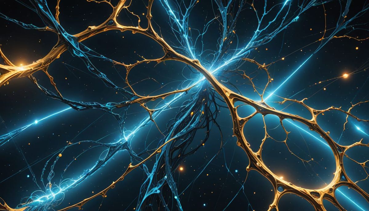 This digital painting features a concept of a cosmic binary system. Two celestial bodies shaped like zero and one are connected by fluidic nebulae, with fractal patterns and geometric structures.