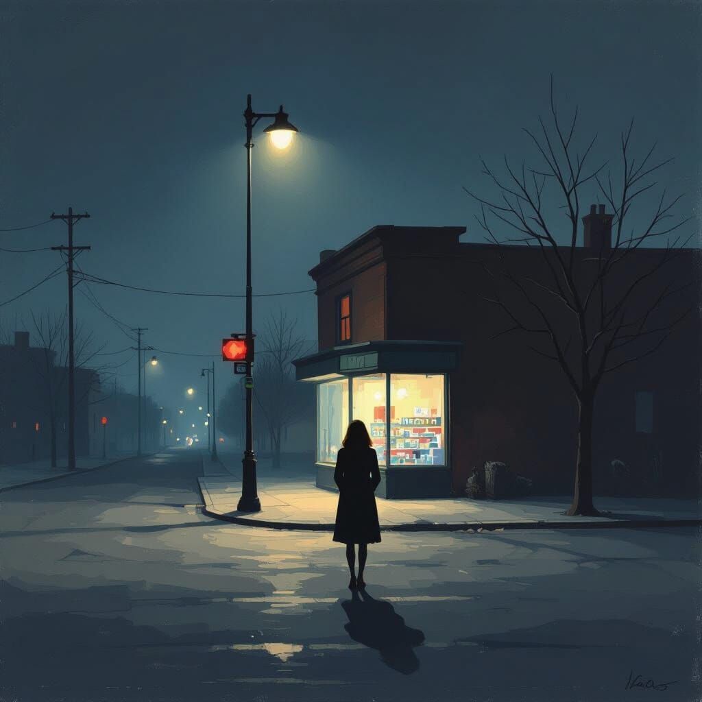 This image shows a solitary woman on a deserted street, illuminated by a dim streetlight near a pharmacy. The scene evokes a sense of urban isolation with cinematic lighting and muted colors.
