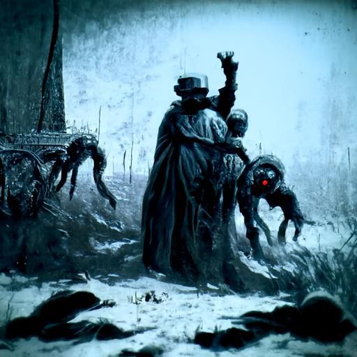 This image depicts a time traveler's revenge in a dark, horror-infused scene. The artwork evokes the style of Gustave Doré with elements reminiscent of Greg Rutkowski.