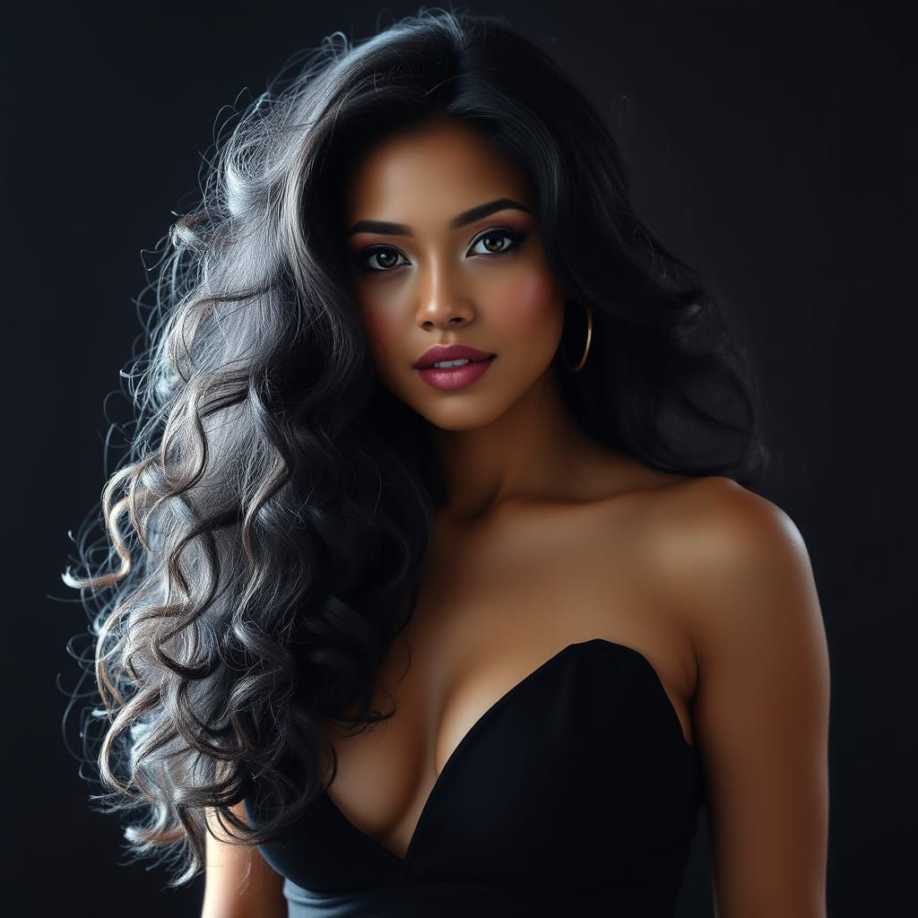 This image shows a vibrant portrait of a beautiful woman with long, wavy black hair, wearing a black dress. The artwork is in the Chimeric Allure V3 style.