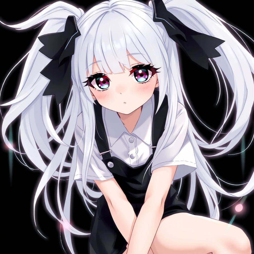 This image shows a pretty anime-style gothic princess with long white and black hair and huge eyes, wearing bib shorts and shirt in a dynamic pose. The artwork features soft, glowing edges and a dreamy, ethereal aesthetic.