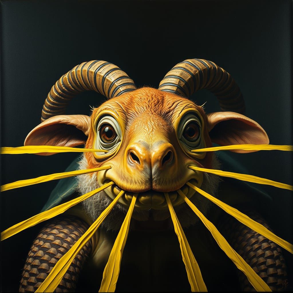 This eerie, hyper-detailed painting features a bizarre marmot sheep turtle hybrid with yellow stripes, rendered in a style inspired by Beksiński and Afremov, using dramatic chiaroscuro lighting.