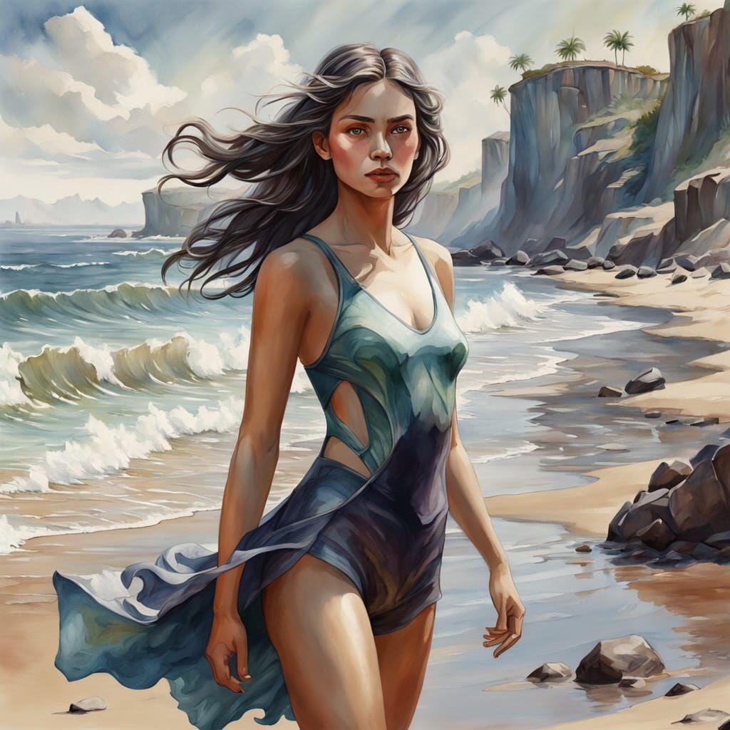 A detailed matte painting of women in swimwear at the beach. The image features deep, complementary colors and intricate details, rendered as fantasy concept art in 8k resolution.