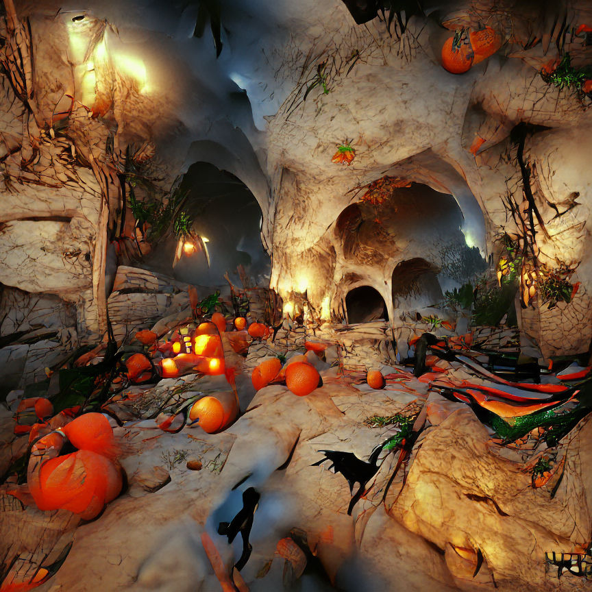 This image depicts a spooky scene of a Halloween cave. The cave is rendered in a maximalist style, using CryEngine for detailed graphics and atmospheric lighting.