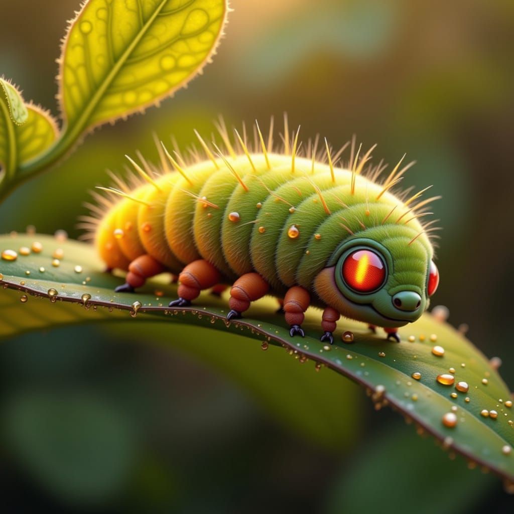 This image shows a fluffy, otherworldly caterpillar resting on a dewy leaf. The macro shot, with its warm lighting and shimmering scales, captures a vibrant fantasy aesthetic with intricate details.