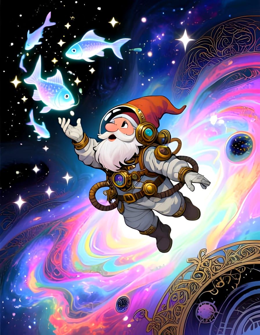 This image depicts a gnome astronaut in steampunk attire, reaching for translucent, energy-based fish creatures amidst vibrant cosmic nebulae and stars. Rendered in a detailed, colorful watercolor and ink style.